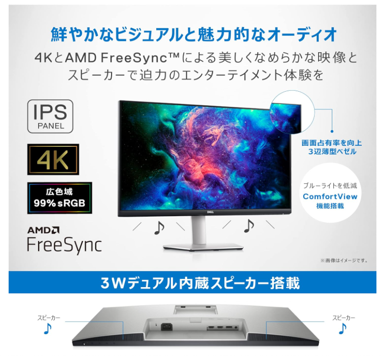 Dell S2721QS 27インチ 4K モニター (3年間無輝点交換保証/IPS非光沢/DP・HDMIx2/sRGB 99%/縦横回転・高さ調節/AMD FreeSync/スピーカー付)