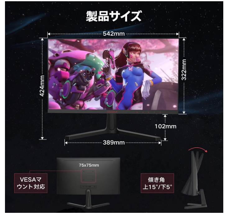 KOORUI 24E4 ゲーミングモニター 24 インチ フルHD 165Hz 1ms VAパネル 非光沢 FPS向き, AdaptiveSync対応, 傾き調節, HDMI X2 / DP/VESA, 144hz モニター