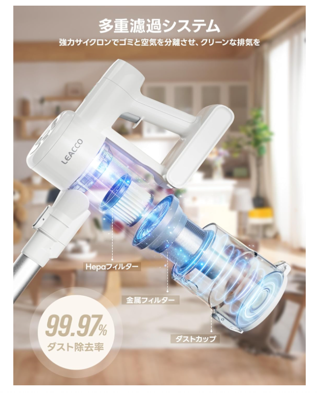 掃除機 コードレス 30000pa Leacco サイクロン 3段吸引力 45分間稼働 スティック掃除機 軽量 10段伸縮パイプ ハンディクリーナー 2way仕様 LEDライト搭載 フローリング/カーペット/畳/ソファー/車用 PSE認証済