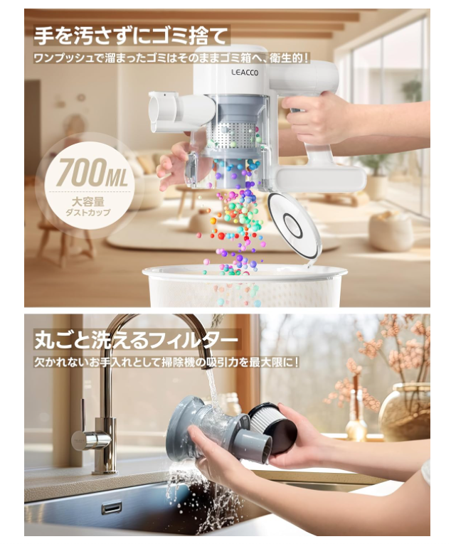 掃除機 コードレス 30000pa Leacco サイクロン 3段吸引力 45分間稼働 スティック掃除機 軽量 10段伸縮パイプ ハンディクリーナー 2way仕様 LEDライト搭載 フローリング/カーペット/畳/ソファー/車用 PSE認証済 LF0026
