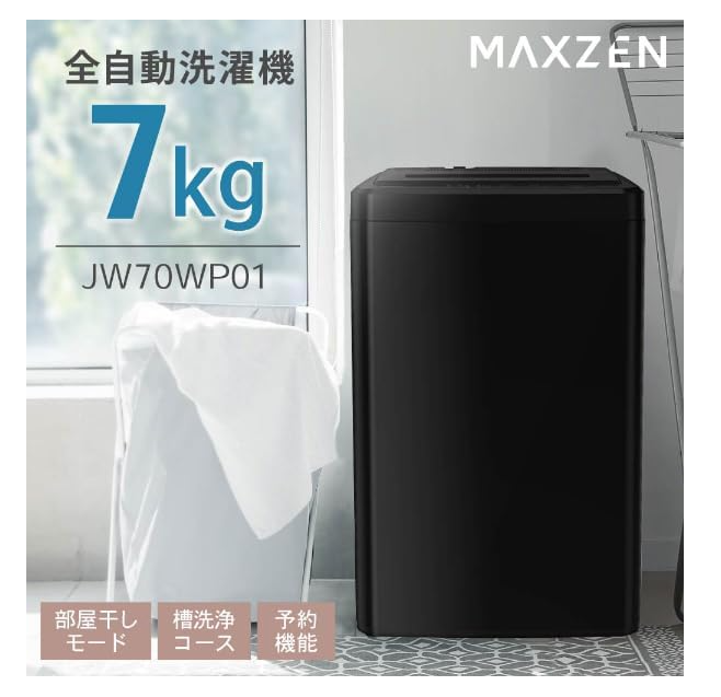 洗濯機 全自動洗濯機 7.0kg 一人暮らし マクスゼン 風乾燥 槽洗浄 凍結防止 チャイルドロック 急速洗い ブラック 黒 MAXZEN JW70WP01BK